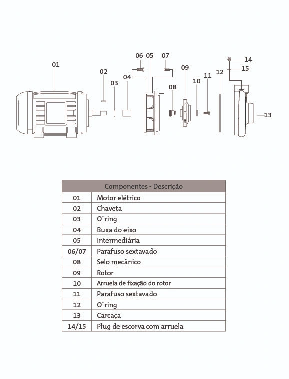 Selo mecânico: Em Viton. Nos casos em que haja a presença de abrasivos recomenda-se o uso do selo de carbeto de silício.