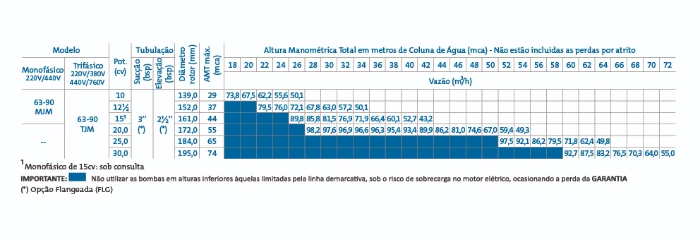 Vedação do eixo – por selo mecânico – Ø 1¼”, tipo “21”- (motores de 10 a 15cv); Ø 1¾”, tipo “21”- (motores de 20 a 30cv), conjunto de precisão, construído com borracha nitrílica, mola de aço inox e faces de vedação em grafite e cerâmica. Temperatura de trabalho do liquido até 80ºC.