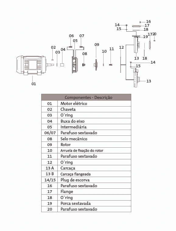 Selo mecânico: Em Viton. Nos casos em que haja a presença de abrasivos recomenda-se o uso do selo de carbeto de silício.