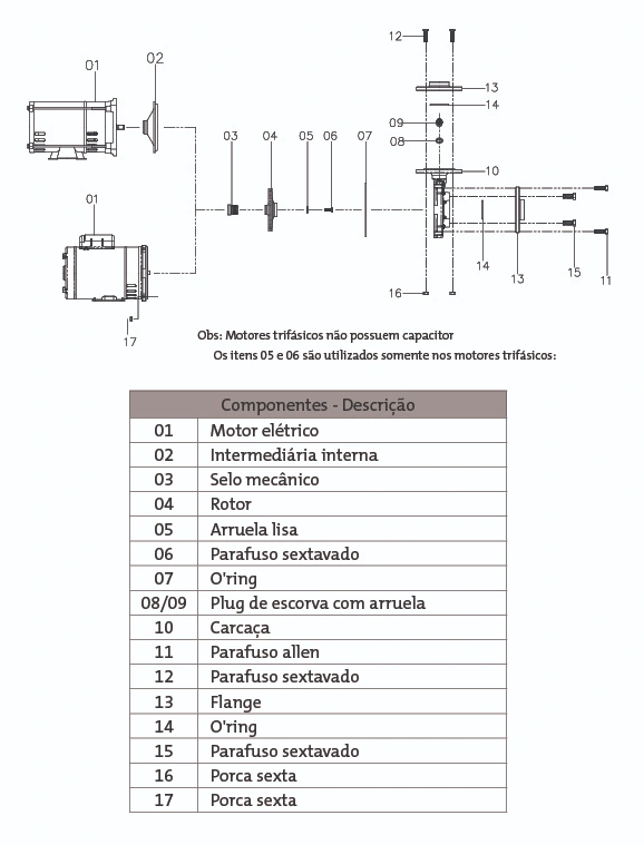 Selo mecânico: Em Viton. Nos casos em que haja a presença de abrasivos recomenda-se o uso do selo de carbeto de silício.