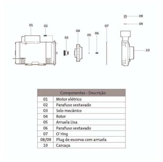 Selo mecânico: Em Viton. Nos casos em que haja a presença de abrasivos recomenda-se o uso do selo de carbeto de silício.