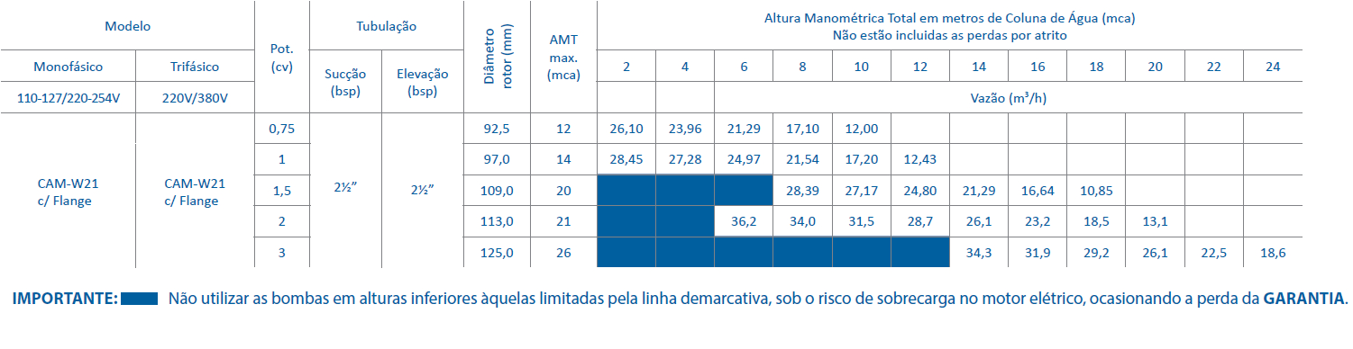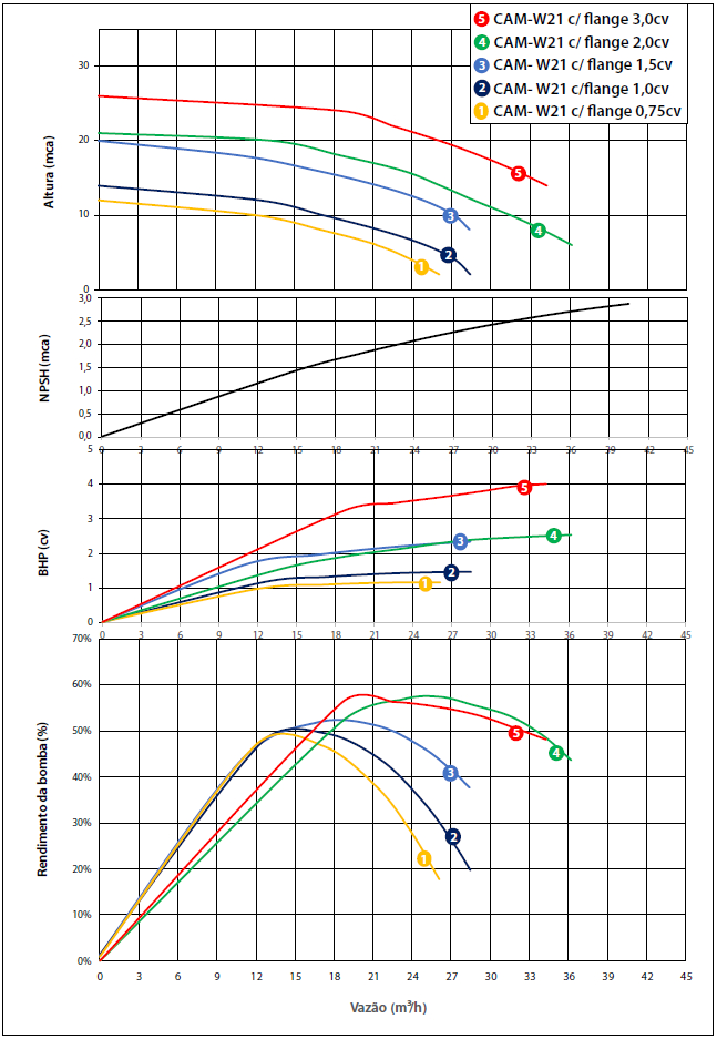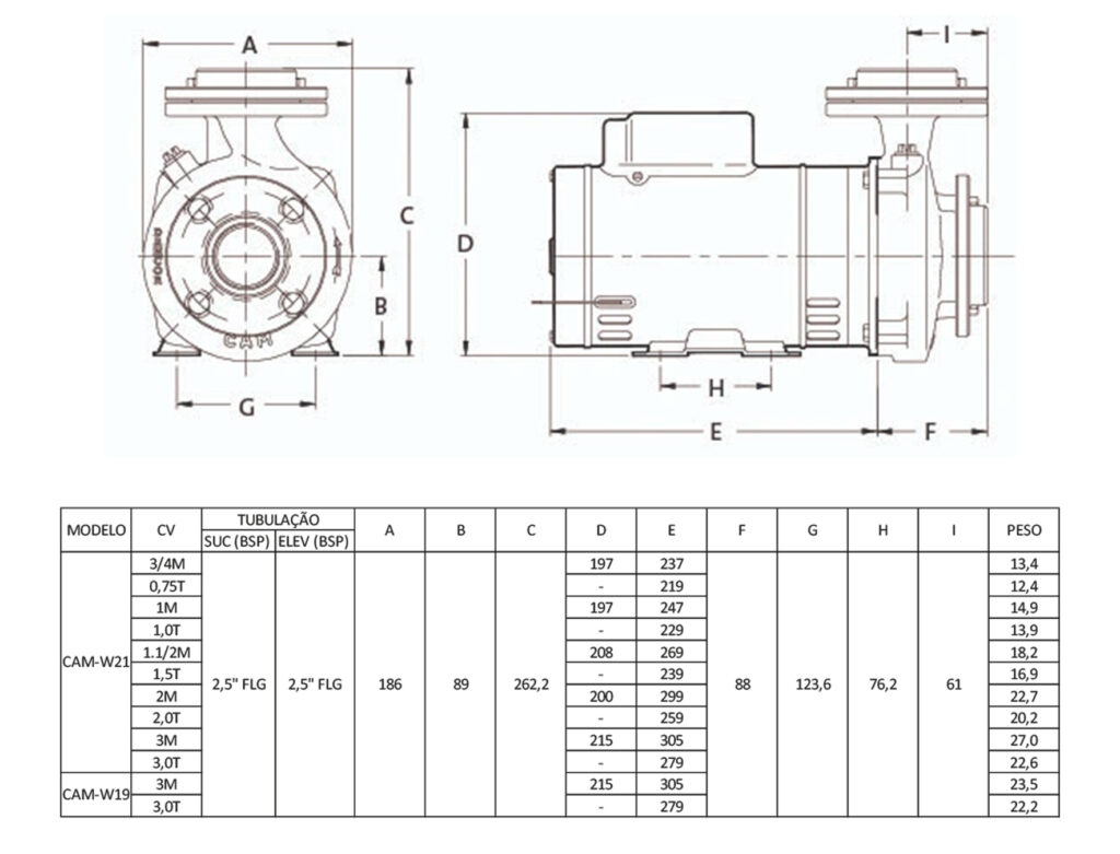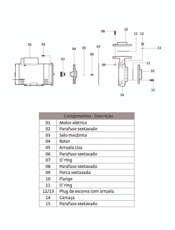 Carcaça e Flange – com voluta em liga especial de alumínio-silício, de alta resistência à pressão e oxidação, bocal de recalque na linha centro/vertical e plug para seu perfeito escorvamento.
