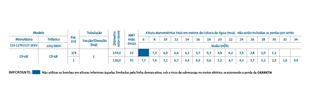 Intermediária Interna e Carcaça – CP-4R em (NYLON), CP-4C em (ABS), todos os termoplásticos reforçados com fibra de vidro não contaminam o líquido bombeado e resistem a determinados produtos químicos (CONSULTAR NOSSO DEPTº DE VENDAS).