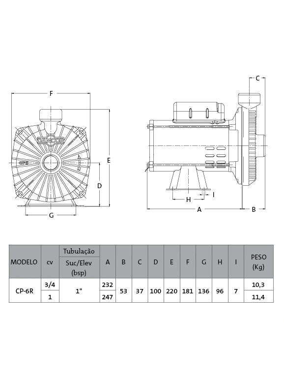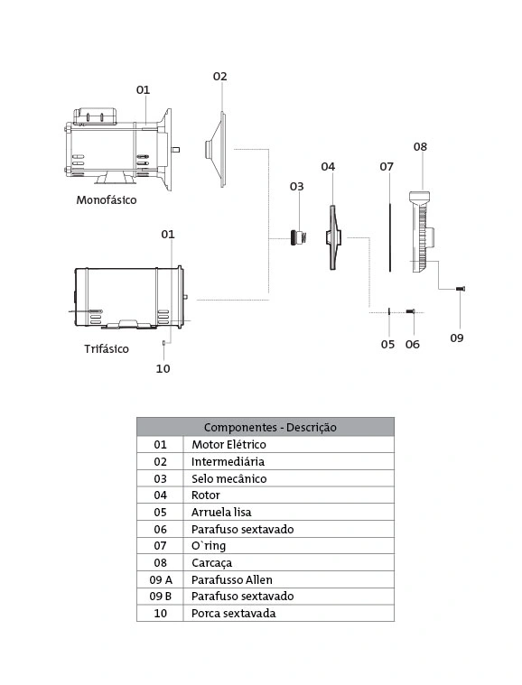 Rotor – Do tipo fechado, injetado em termoplástico de engenharia, Noryl®, de alta resistência, reforçado com fibra de vidro, roscada diretamente na ponta do eixo.