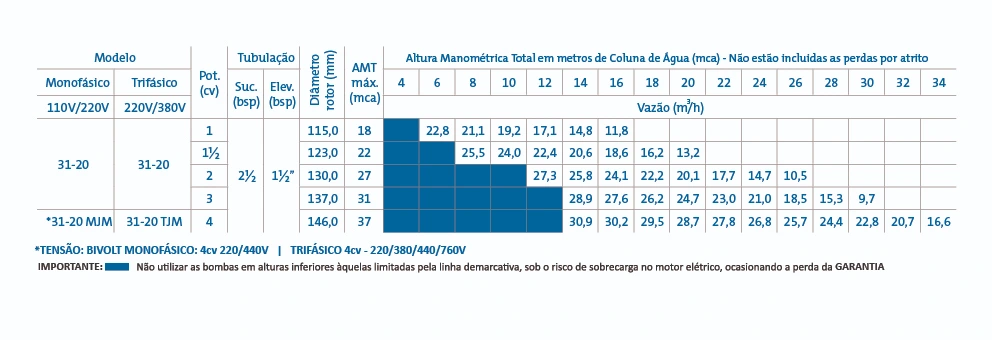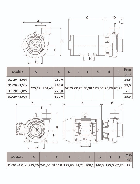 Rotor -tipo fechado, construído em liga especial de alumínio-silício roscado, diretamente na ponta do eixo do motor (1,0 a 3,0 cv) e fixado por meio de parafuso e arruela de fixação, e chaveta (motor de 4,0 cv).