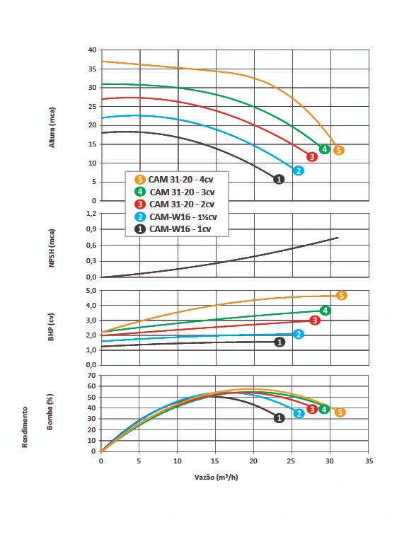 Vedação do eixo – por selo mecânico – ø 5/8”, tipo 16 (motores de 1,0 a 3,0cv); ø 1¼”, tipo 21 (motor 4,0cv), conjunto de precisão, construído com borracha nitrílica, mola de aço inox e faces de vedação em grafite e cerâmica. Temperatura de trabalho do liquido até 80ºC.