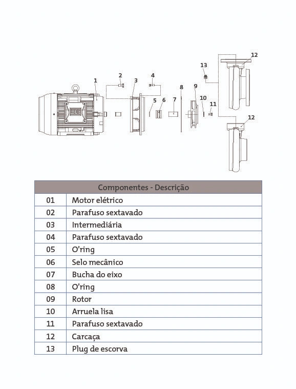 Rotor – tipo fechado, construído em liga especial de alumínio-silício e fixados por meio de chaveta, arruela e parafuso de fixação.