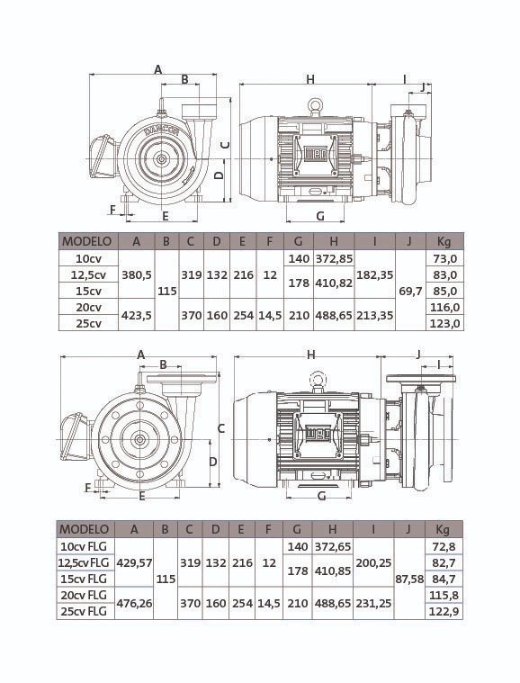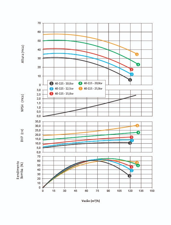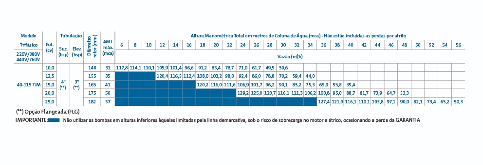 Vedação do eixo – por selo mecânico de 1¼” para potências de 10; 12,5 e 15cv e 1¾” para potências de 20 e 25cv, tipo 21 – conjunto de precisão, construído com borracha nitrílica, mola de aço inox e faces de vedação em grafite e cerâmica. Temperatura de trabalho do líquido até 80ᴼC.