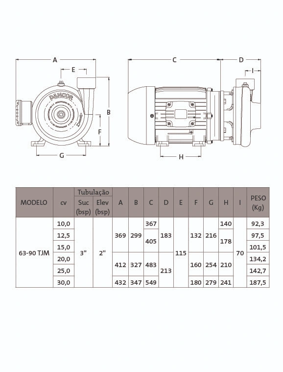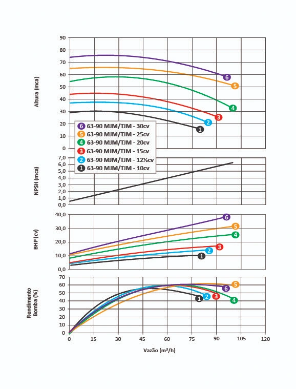 Vedação do eixo – por selo mecânico – Ø 1¼”, tipo “21”- (motores de 10 a 15cv); Ø 1¾”, tipo “21”- (motores de 20 a 30cv), conjunto de precisão, construído com borracha nitrílica, mola de aço inox e faces de vedação em grafite e cerâmica. Temperatura de trabalho do liquido até 80ºC.