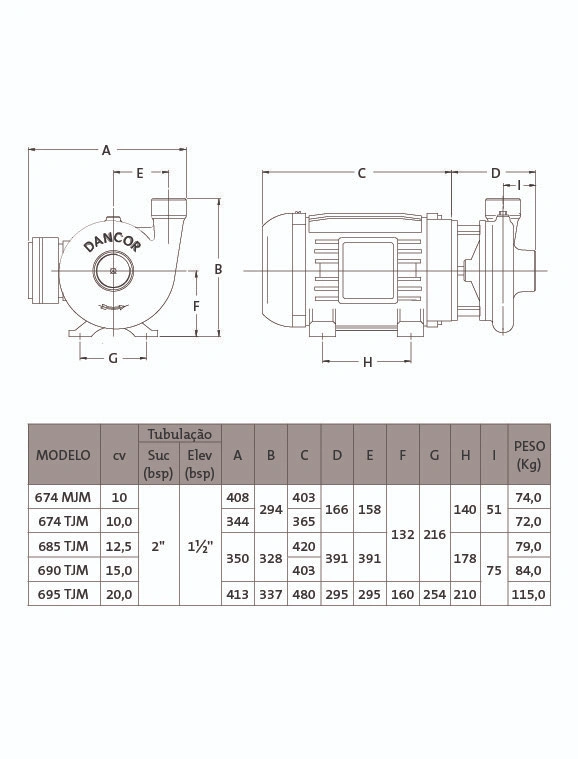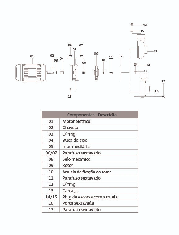 Rotor – do tipo fechado, construído em liga especial de alumínio-silício e fixadas por meio de chaveta, arruela e parafuso de fixação.