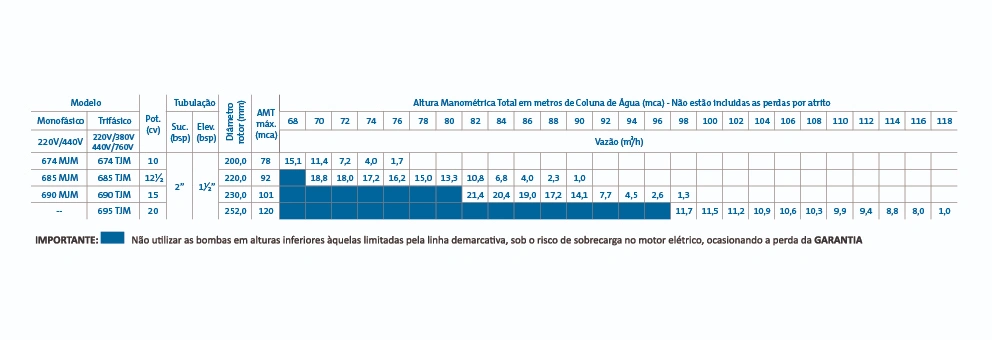 Vedação do eixo – por selo mecânico – Ø 1.1/4″, tipo “21”- (motores de 10 e 15cv); Ø 1.3/4”, tipo “21”- (motores de 20cv), conjunto de precisão, construído com borracha nitrílica, mola de aço inox e faces de vedação em grafite e cerâmica. Temperatura de trabalho do liquido até 80ºC.