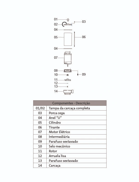 Tampa, Intermediária e Carcaça – Em liga especial de alumínio-silício, de alta resistência à pressão e à ação oxidante.